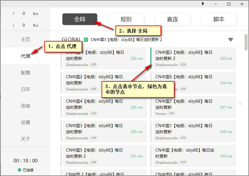 三、选择节点,点击 代理,选中全局,点击选中节点,绿色为已选中的节点。