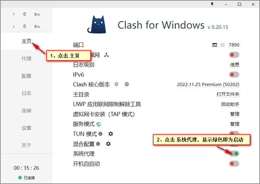 四、启动代理,点击主页,点击 系统代理,显示为绿色为启动,即可科学上网。