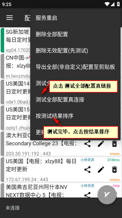 六、获取节点完毕后,点击测试全部配置真链接,测试完毕后,点按结果排序。