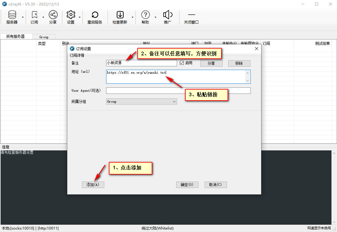 1、点击添加,增加一条新的订阅信息栏2、填写备注:可以任意填写,比如:小林资源