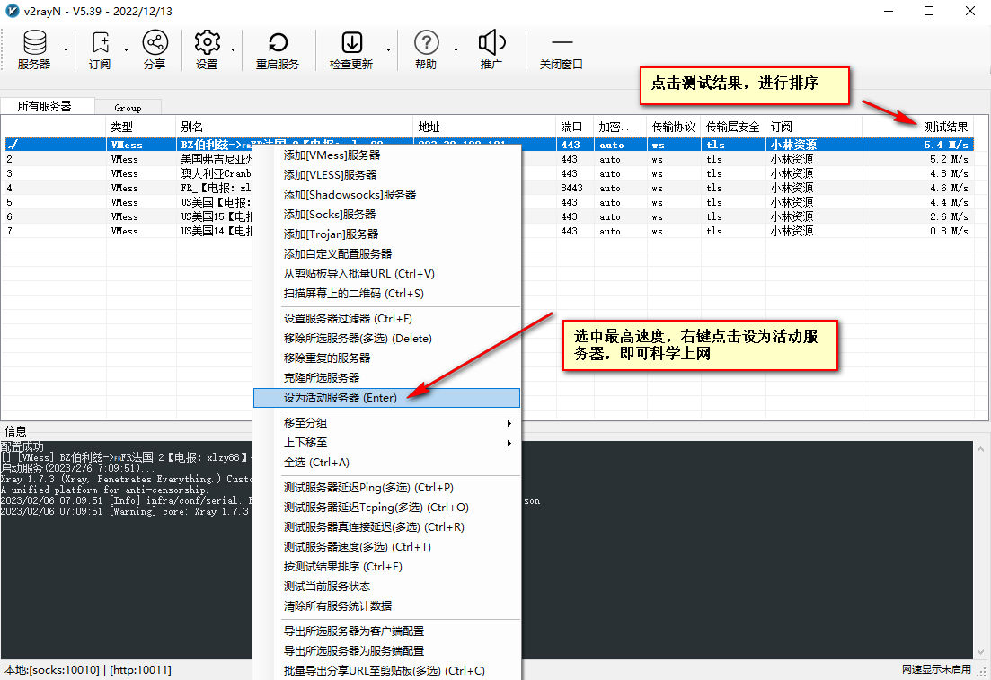 五、点击测试结果,进行速度排序,选中最高速度,右键点击 设为活动服务器,既可科学上网。