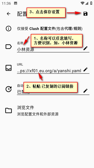 四、1.填写名称可以任意填写,方便识别,如:小林资源,2.粘贴已复制的订阅链接,3.点击保存设置