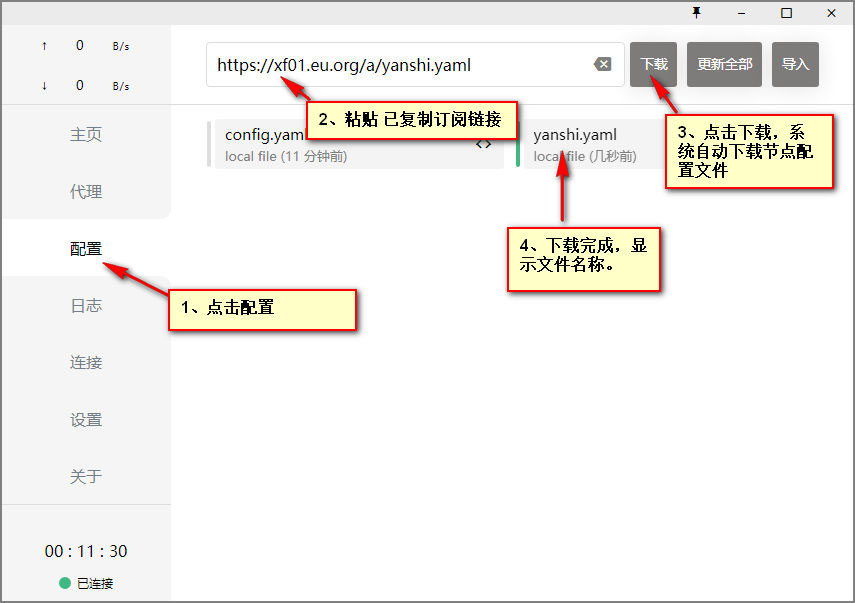 二、添加订阅链接,点击设置,粘贴 已复制的订阅链接,点击下载,系统自动下载节点配置文件。
