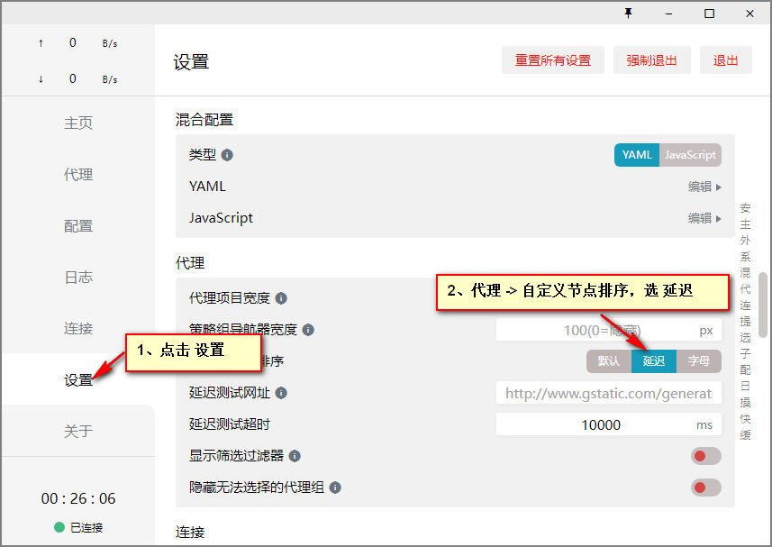 一、设置按延迟排序,点击设置,代理栏 自定义节点排序,选延迟