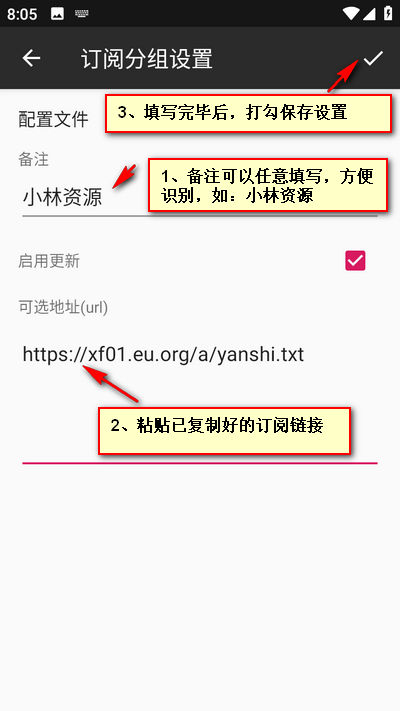 三、备注可以任意填写,方便识别,如:小林资源,填写完毕,点击打勾保存设置