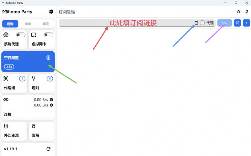 然后点击红色箭头处太填入订阅链接或点击蓝色箭头出粘贴按钮直接粘贴。