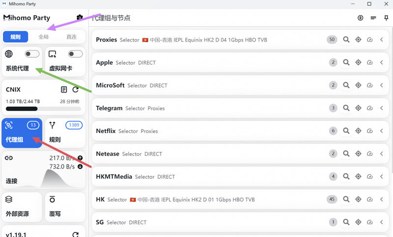 紫色箭头处可以选择软件代理模式,规则:根据配置文件规则判断当前网站走不走代理。全局:所有的网站都走代理。直连:所有的网站都不走代理。