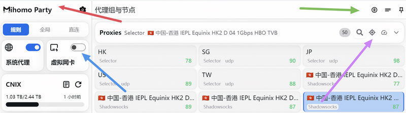 紫色箭头处从左至右三个图标依次为搜索节点、定位到当前选择的节点、测试延迟。
